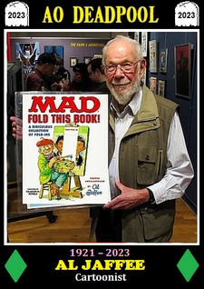 | 75. Al Jaffee Died April 10, 2023 Age 102 3 hits by Eternity Tours, Go the Distance, and Old Lady 2 points (1 for hit + 1 for trio) |