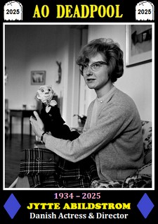 Jytte Abildstrom Died January 2, 2025 Age 90 2 hits by gcreptile and The Remarkable Mr. Monwar (Daily Double) 5 points (2 for hit + 3 for duet) |